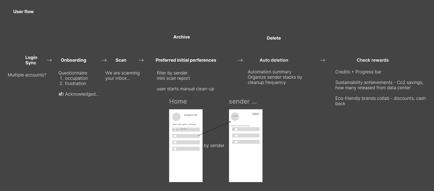 Users declutter their inboxes —> earn rewards that encourage sustainable purchases —> more aware of their overall environmental impact —> continue using the app
