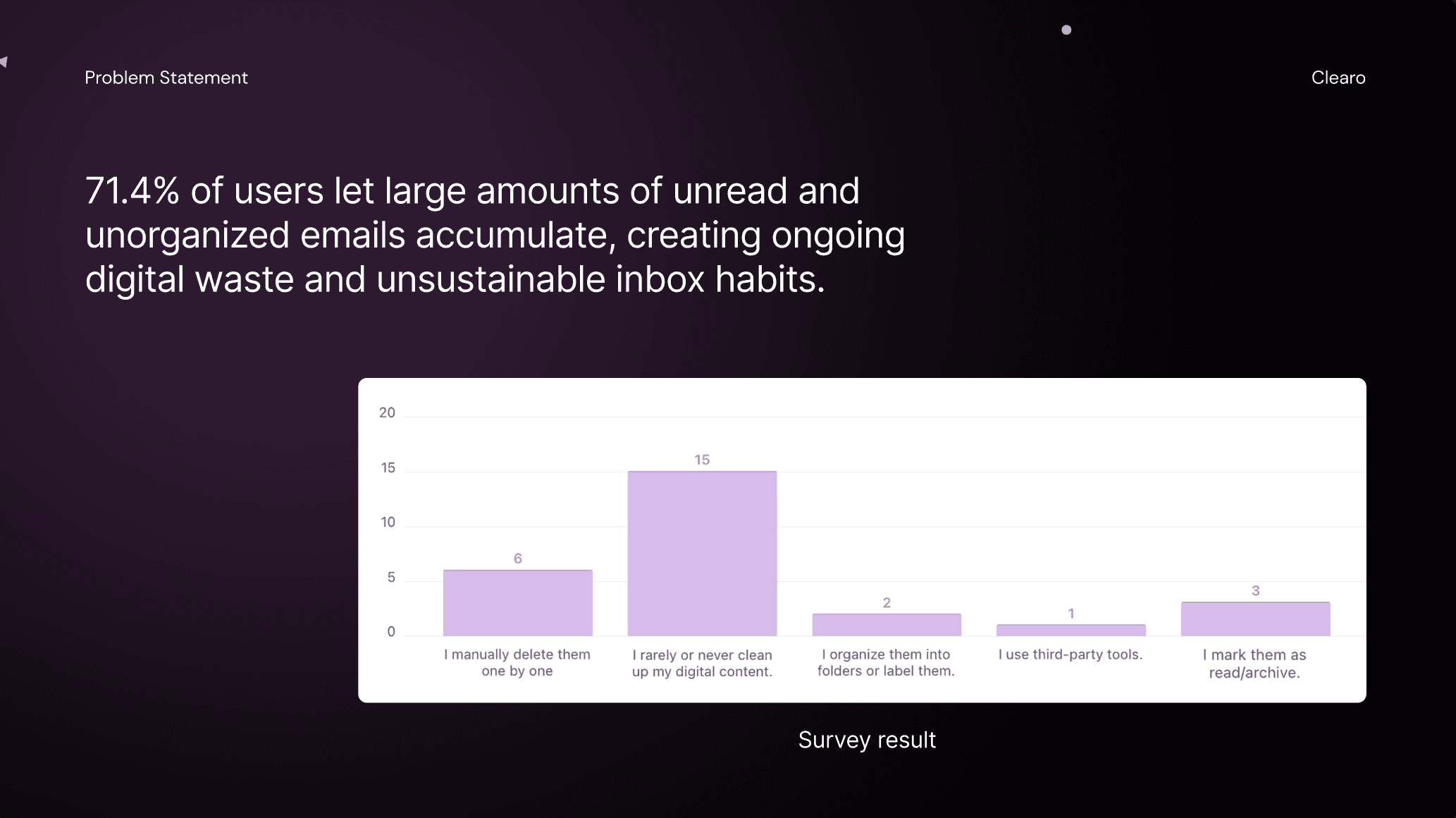 Our next step is to move beyond the prototype stage and conduct usability testing to understand how users interact with Clearo. This will help us identify which parts of the design need improvement and ensure the experience is intuitive and effective. We also plan to expand Clearo beyond emails to help users manage other areas like photos and files. We also plan to partner with AI companies, like Manus AI, in the reward systems to help motivate users to maintain sustainable digital habits.